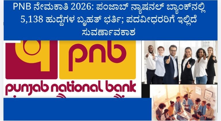 PNB ನೇಮಕಾತಿ 2026: ಪಂಜಾಬ್ ನ್ಯಾಷನಲ್ ಬ್ಯಾಂಕ್ನಲ್ಲಿ 5,138 ಹುದ್ದೆಗಳ ಬೃಹತ್ ಭರ್ತಿ; ಪದವೀಧರರಿಗೆ ಇಲ್ಲಿದೆ ಸುವರ್ಣಾವಕಾಶ! ಬೆಂಗಳೂರು: ದೇಶದ ಉದ್ಯೋಗಾಕಾಂಕ್ಷಿಗಳಿಗೆ, ವಿಶೇಷವಾಗಿ ಬ್ಯಾಂಕಿಂಗ್ ಕ್ಷೇತ್ರದಲ್ಲಿ ವೃತ್ತಿಜೀವನವನ್ನು …