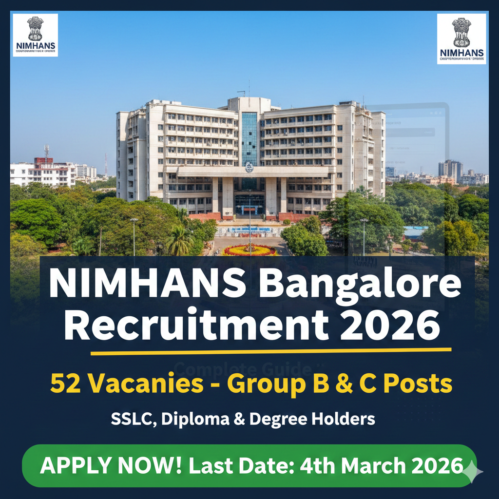 ಬೆಂಗಳೂರು ನಗರದಲ್ಲಿ ವಾಸಿಸುತ್ತಾ ಪ್ರತಿಷ್ಠಿತ ಸರ್ಕಾರಿ ಸಂಸ್ಥೆಯಲ್ಲಿ ಕೆಲಸ ಮಾಡಬೇಕು ಎಂಬುದು ಅನೇಕರ ಕನಸು. ಆ ಕನಸನ್ನು ನನಸು ಮಾಡಲು ಈಗ ರಾಷ್ಟ್ರೀಯ ಮಾನಸಿಕ ಆರೋಗ್ಯ ಮತ್ತು ನರ ವಿಜ್ಞಾನ ಸಂಸ್ಥೆ (NIMHANS) ಅದ್ಭುತ ಅವಕಾಶವನ್ನು ನೀಡಿದೆ. 2026ರ ಸಾಲಿನ ನೇಮಕಾತಿಯಲ್ಲಿ ಒಟ್ಟು 52 ಗ್ರೂಪ್ ಬಿ (Group B) ಮತ್ತು ಗ್ರೂಪ್ ಸಿ (Group C) ಹುದ್ದೆಗಳನ್ನು ಭರ್ತಿ ಮಾಡಲು ಅಧಿಸೂಚನೆ ಹೊರಡಿಸಿದೆ.