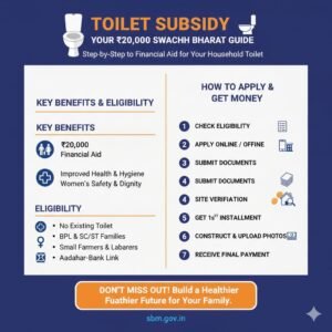 ​ಭಾರತದ ಪ್ರತಿಯೊಂದು ಕುಟುಂಬವೂ ಘನತೆ ಮತ್ತು ಆರೋಗ್ಯಕರ ಜೀವನವನ್ನು ನಡೆಸಬೇಕೆಂಬುದು ಸರ್ಕಾರದ ಆಶಯ. ಇದಕ್ಕಾಗಿ ಜಾರಿಗೆ ಬಂದಿದ್ದೇ ಸ್ವಚ್ಛ ಭಾರತ ಮಿಷನ್ (Swachh Bharat Mission). ಈ ಯೋಜನೆಯ ಅಡಿಯಲ್ಲಿ ಬಯಲು ಶೌಚ ಮುಕ್ತ ಭಾರತವನ್ನು ನಿರ್ಮಿಸಲು ಸರ್ಕಾರವು ಶೌಚಾಲಯ ಇಲ್ಲದ ಕುಟುಂಬಗಳಿಗೆ ಆರ್ಥಿಕ ನೆರವು ನೀಡುತ್ತಿದೆ. 2026ರಲ್ಲಿ ಈ ಯೋಜನೆಯು ಮತ್ತಷ್ಟು ಸರಳೀಕೃತಗೊಂಡಿದ್ದು, ಅರ್ಹ ಫಲಾನುಭವಿಗಳಿಗೆ ₹20,000 ವರೆಗೆ ಸಹಾಯಧನ ಸಿಗುತ್ತಿದೆ. ಈ ಲೇಖನದಲ್ಲಿ ನಾವು ಈ ಸಬ್ಸಿಡಿಯನ್ನು ಪಡೆಯುವುದು ಹೇಗೆ ಎಂಬ ಬಗ್ಗೆ ಸಂಪೂರ್ಣವಾಗಿ ಚರ್ಚಿಸೋಣ.
